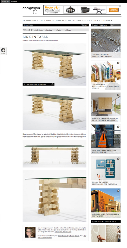 Our ‘Link-In’ Table is now featured on Design Milk, a multi-faceted online blog dedicated to Art, Architecture & Design. Please visit us on Design Milk and take the time to explore the multitude of other creative work published daily.