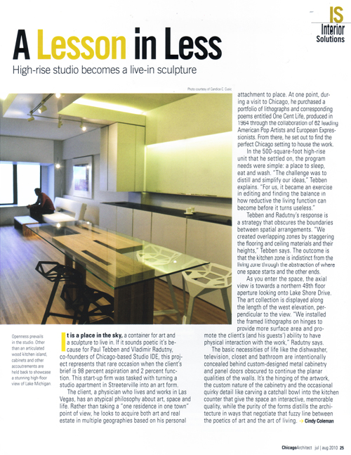 Unit 4906 was recently featured in the July / August issue of Chicago Architect Magazine. In an article titled, “A Lesson in Less,” our project is broken down by talented Architect & Author, Cindy Coleman.