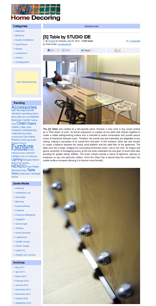 [S]Table was recently featured on Home Decoring, an online blog showcasing noteworthy interior & product design projects from around the world.