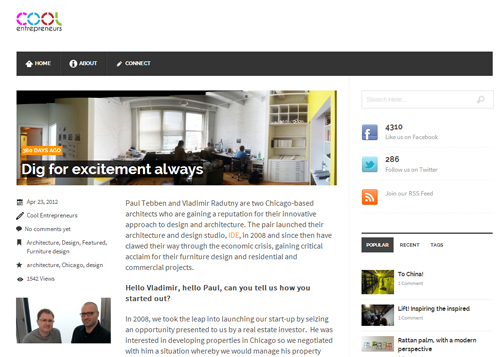 We were featured today on the blog Cool Entrepreneurs, “a photo blog that illustrates the lives of people around the world who have created fascinating careers for themselves. An entrepreneurial life can be so incredibly creative and downright fun—that’s what we mean with ‘cool’ entrepreneurs. Our goal is to illustrate that potential in its full, rich variety. It is inspiration for a creative life.”