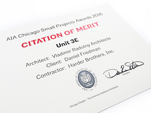 On Thursday, May 5th, we were honored to receive an AIA Chicago Small Projects Award. Our Unit 3E project was recognized with a Citation of Merit.
