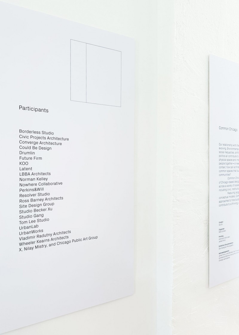 Architecture and landscape architecture offices featured in the exhibition include Borderless Studio, Civic Projects Architecture, Converge Architecture, Could Be Design, Drumlin, Future Firm, KOO, Latent, LBBA Architects, Norman Kelley, Nowhere Collaborative, Perkins&Will, Resolver Studio, Ross Barney Architects, Site Design Group, Studio Becker Xu, Studio Gang, Tom Lee Studio, UrbanLab, UrbanWorks, Vladimir Radutny Architects, Wheeler Kearns Architects, and X, Nilay Mistry, and Chicago Public Art Group.
