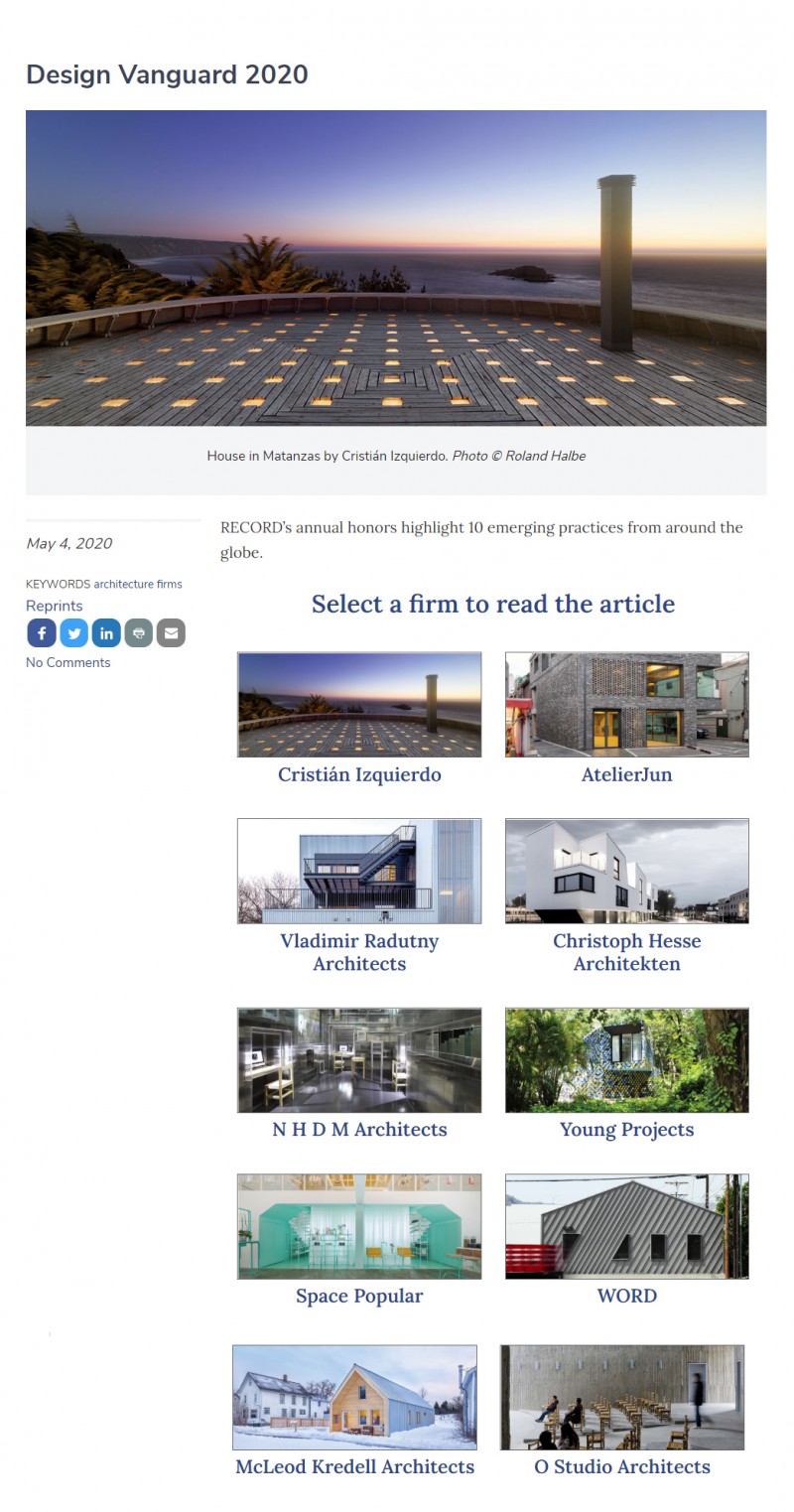 Vladimir Radutny Architects is named one of 10 emerging practices from around the globe by Architectural Record. Started in 2000, Design Vanguard is an annual feature whereby Architectural Record features emerging practices that are demonstrating inventive approaches to shaping the built environment.
