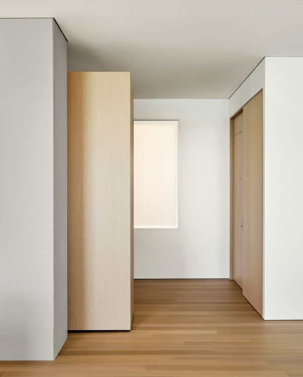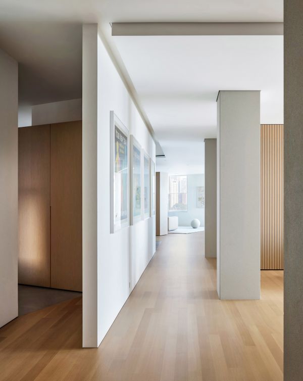 The geometry and scale of the building’s footprint presented opportunities to articulate new walls, ceilings and material transitions in unexpected ways. White oak cabinetry meanders throughout the apartment, gracefully interacting with the columns, ceilings, and floors. Thin steel frames with obscured glass transmit light from both the east and the west into a central circulation that connects sleeping and living. This connector serves as a gallery space where the walls guide the occupants and act as blank canvas for an ongoing collection of personal objects and art.
