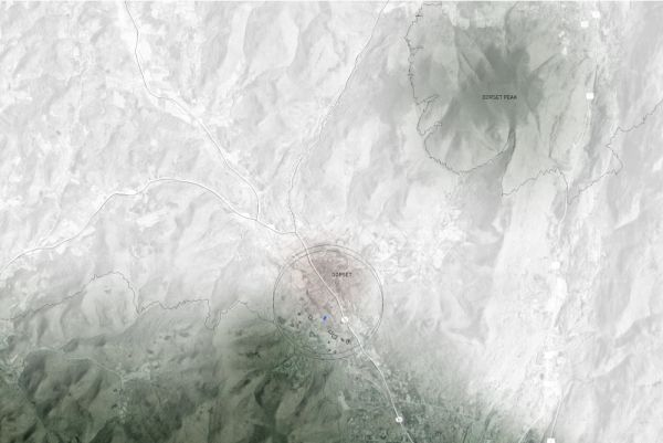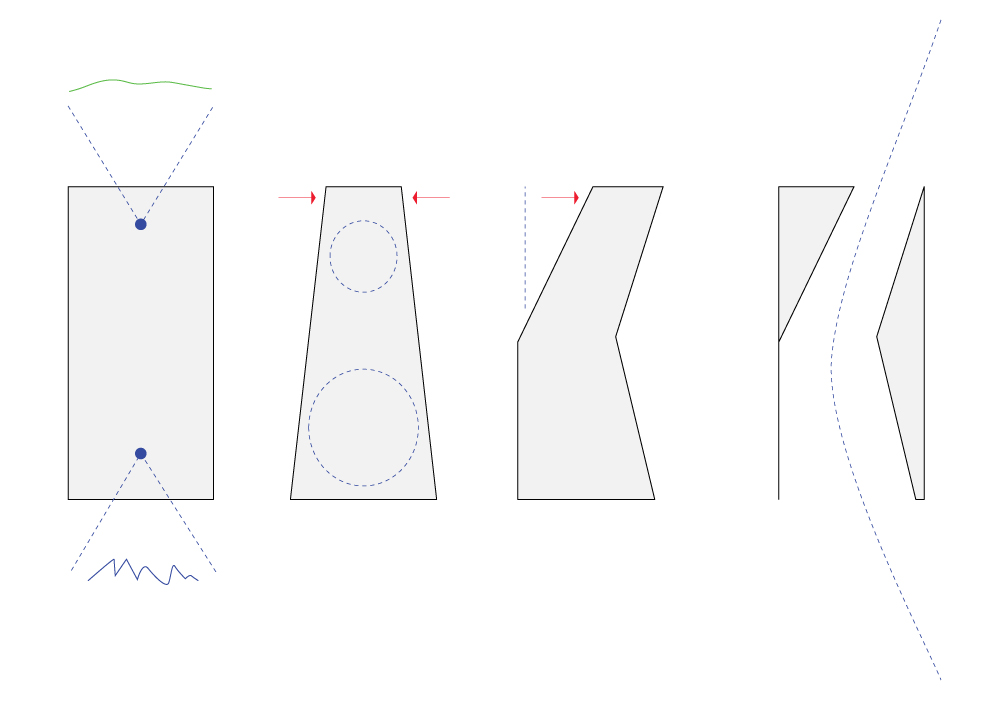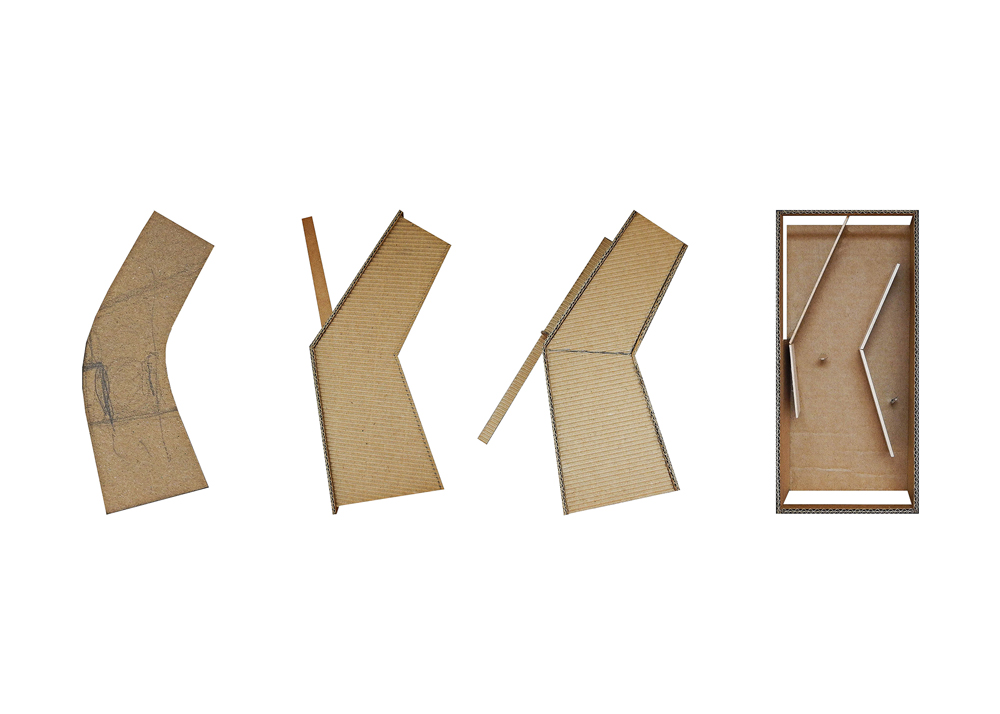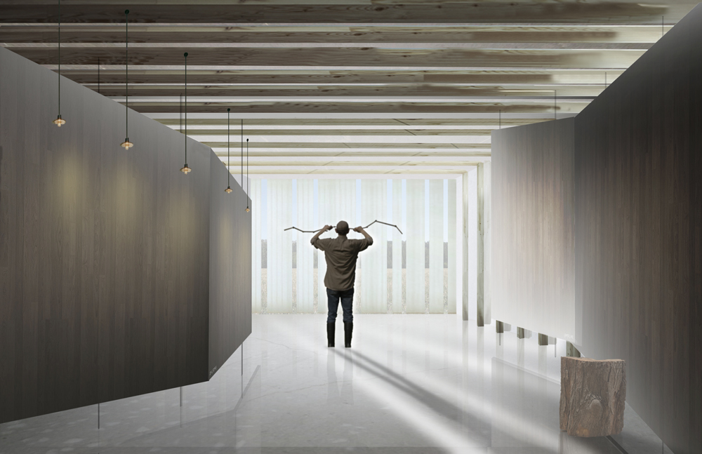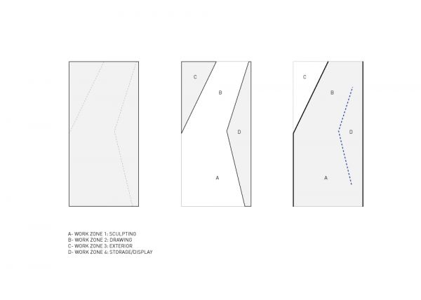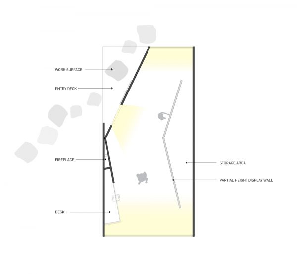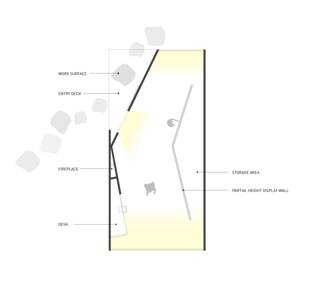 The primary work area is located within an implied viewing tube of inspiration, defined by partial height walls inside a rectangular cedar clad enclosure. The plan contains double-sided display walls, desk space, distinct working zones and back of house storage, all within one open space. A wood-burning fireplace exists at the hinge point inside, keeping the space functional during the cold winter months.