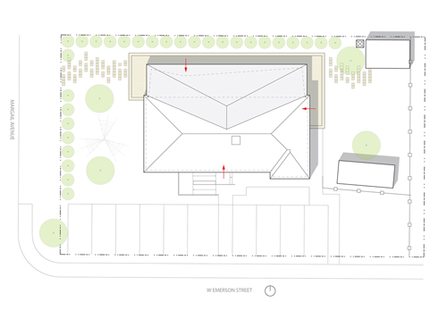 Because the rear of the building is in close proximity to its neighbors, we wanted to reduce the scale and appearance of this newly added structure. It therefore sits in subtle contrast to the existing building configuration in geometry and material and is meant to read as an insertion rather than an addition. What appears as a kink in the rear façade, is a response to a strict build able area requirements. This architectural gesture forms a new entry and re-appropriates square footage to the zones in the building which need it more.