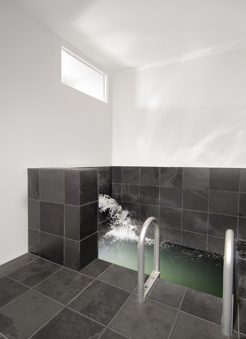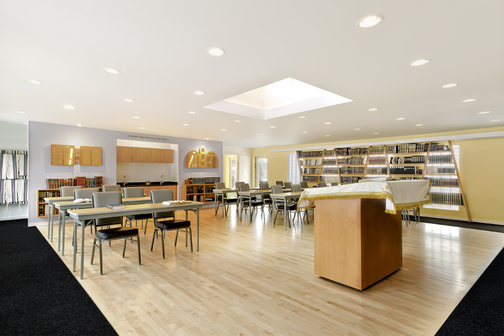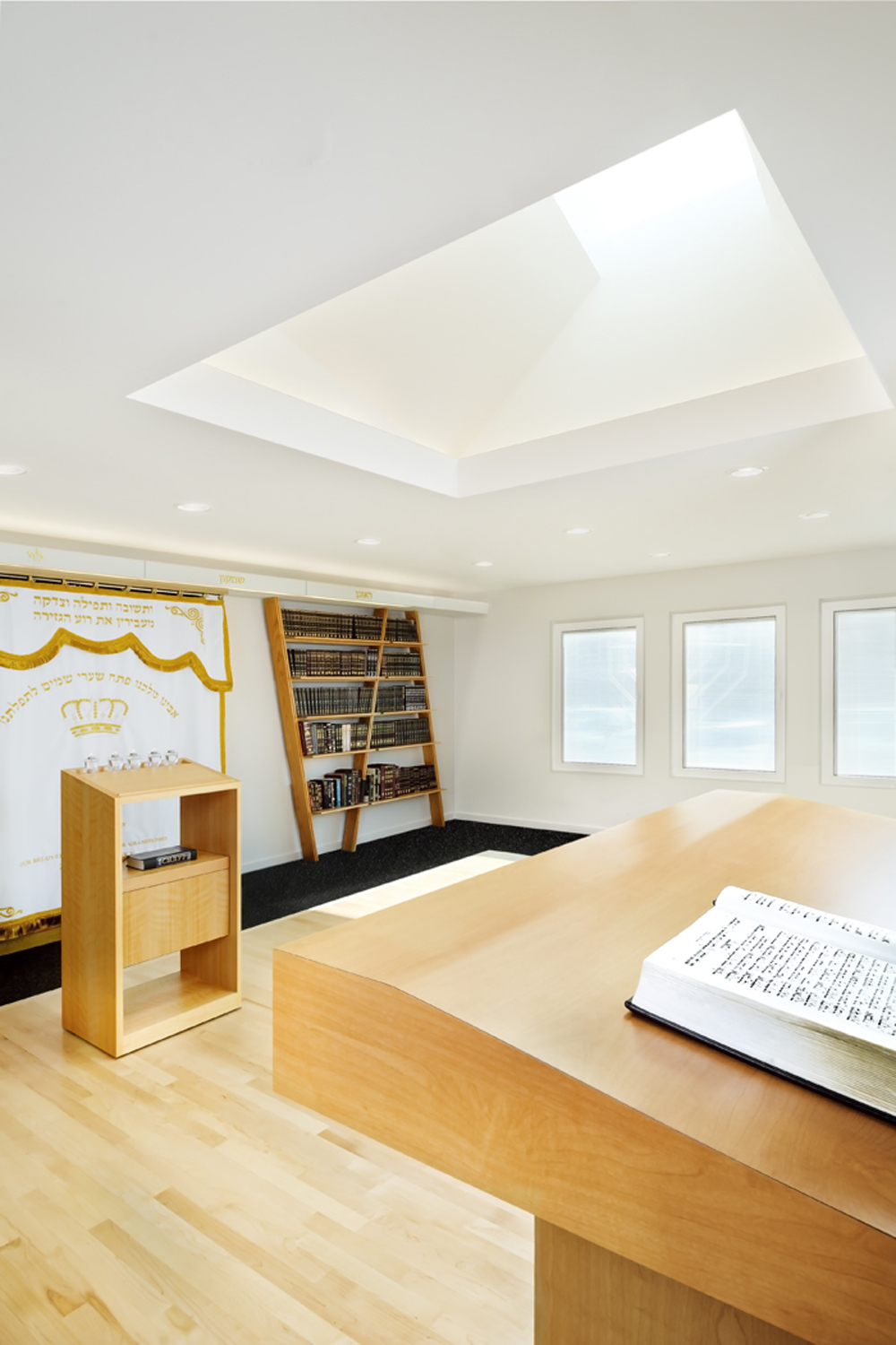 The organization of this newly renovated building was thought of in three parts, two service zones that flank the sanctuary space at the east and west sides. This resulted in a square plan for the main gathering space, providing greater flexibility for various functions and events. A new large skylight was inserted into the space to add much needed ceiling height for the ritual raising of the Torah (Hebrew Bible Scroll) during prayers. Book shelves wrap the space and are arranged in a diagonal pattern, subtly echoing the lines in the Star of David.  Their placement is meant to be a reminder to the occupants that this religious center is not only a place for prayer but a sanctuary for learning as well.