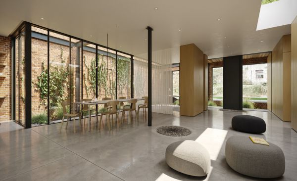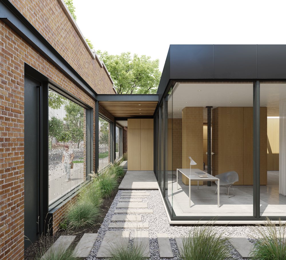 The building extends to the lot lines on three sides and amidst the rezoning process, the municipality mandated these three visible facades were to be kept. As such, we used this directive as an opportunity to resolve the two key elements the existing configuration lacked -privacy and daylight. Thus, we looked to the existing roof as a solution to create an interior courtyard. In cutting away the existing roof along the southern and eastern exterior walls, a newly formed semi-private space becomes a living threshold between the street’s hard edge and a new glass enclosure. Now, the sun’s rays are able to penetrate deep into the footprint of the home, revealing the poetic qualities of these masonry walls, which also serve as a new elevation seen from within.