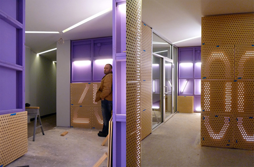 Large, backlit address signage illuminates the space, projecting its colored light onto the street. The rhythm of new floor & wall finishes, together with varying ceiling heights, complements an elaborate arrangement of new lights and wood panels. With the introduction of these new elements, the imbalance in scale between the former industrial function of the building and its current residential use is mediated. This renovation adds a new chapter in the historic timeline of the Locomobile building.