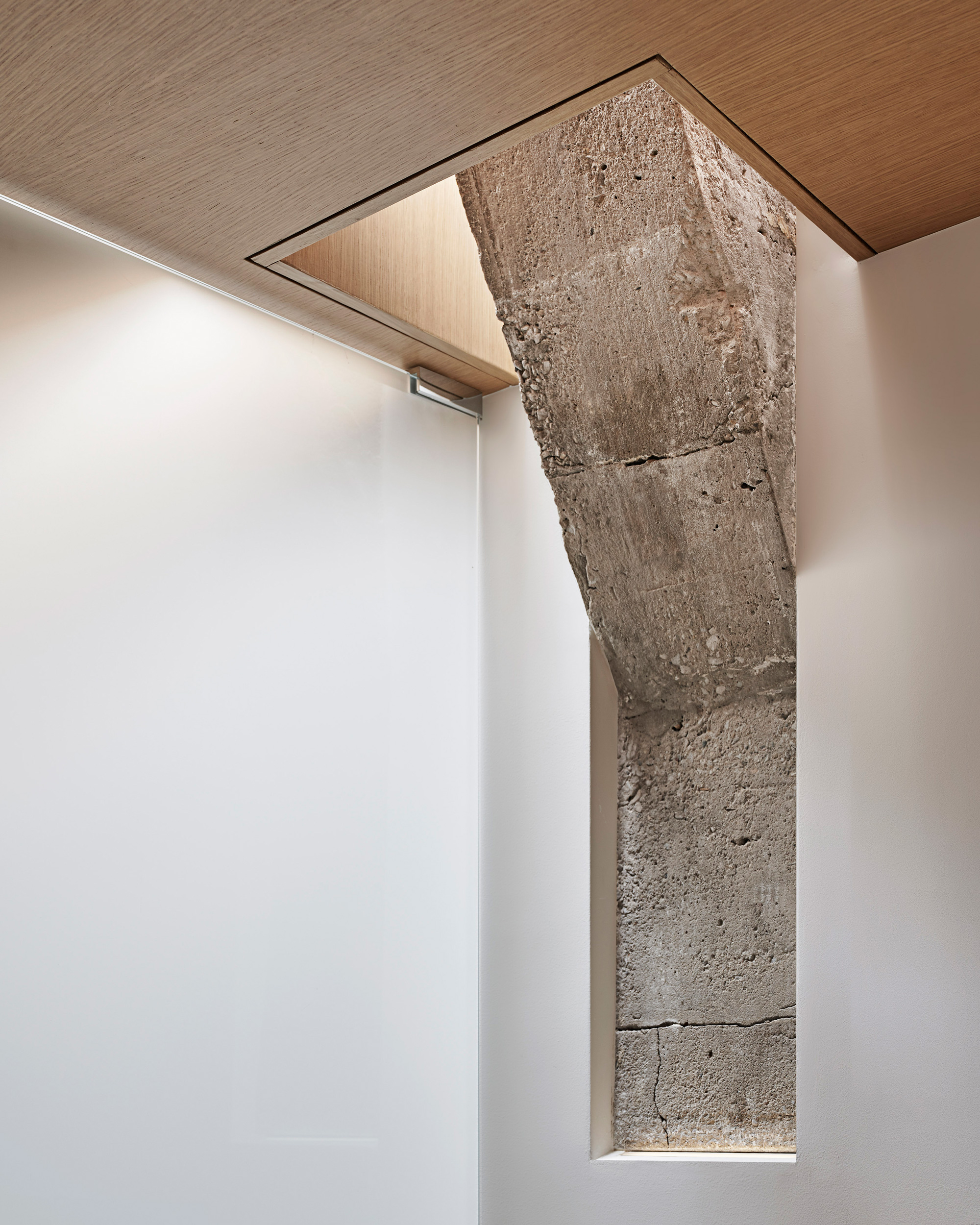 As one moves between levels, a variety of unexpected vantage points and views are revealed. These upper levels function as sleeping space for visitors and couple’s work zones, enabling open living to have both separation and connectivity throughout the day. At the upper loft, where one finally comes close with the concrete ceiling, a doorway leads to a vast outdoor garden with views of our city’s majestic skyline.