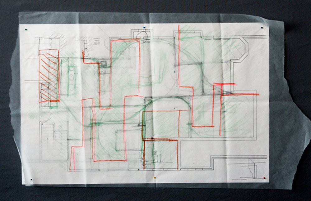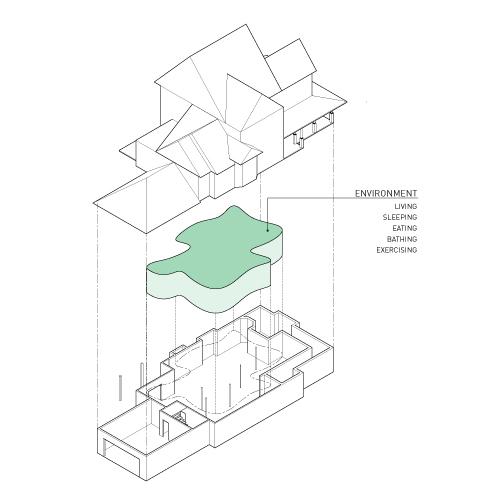 The ceiling soffit adds an organizational framework between the vertical variation in the ceiling height and the overall plan. Its geometry is derived from the boundaries of existing infrastructural elements and runs counter to the direction of the spatial flow. The new vegetation embraces the walls, transforming the space and in time, enriches the planted environment.