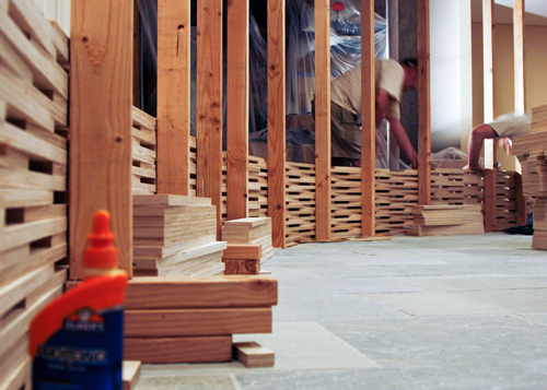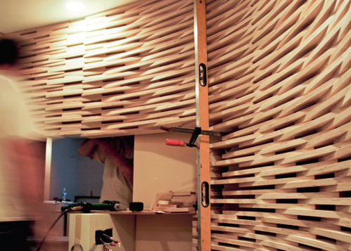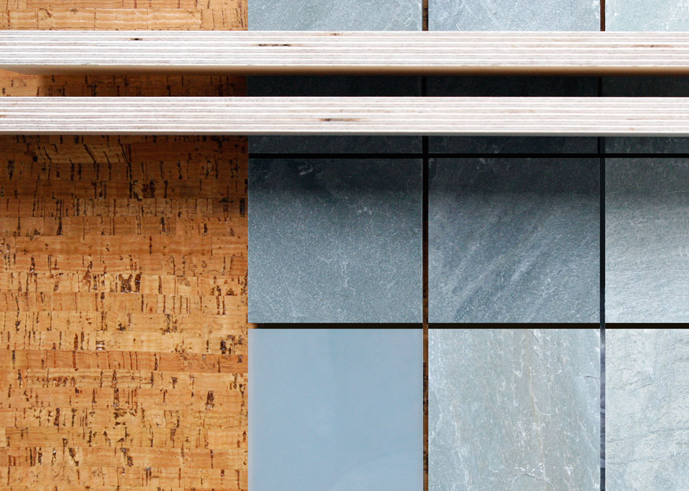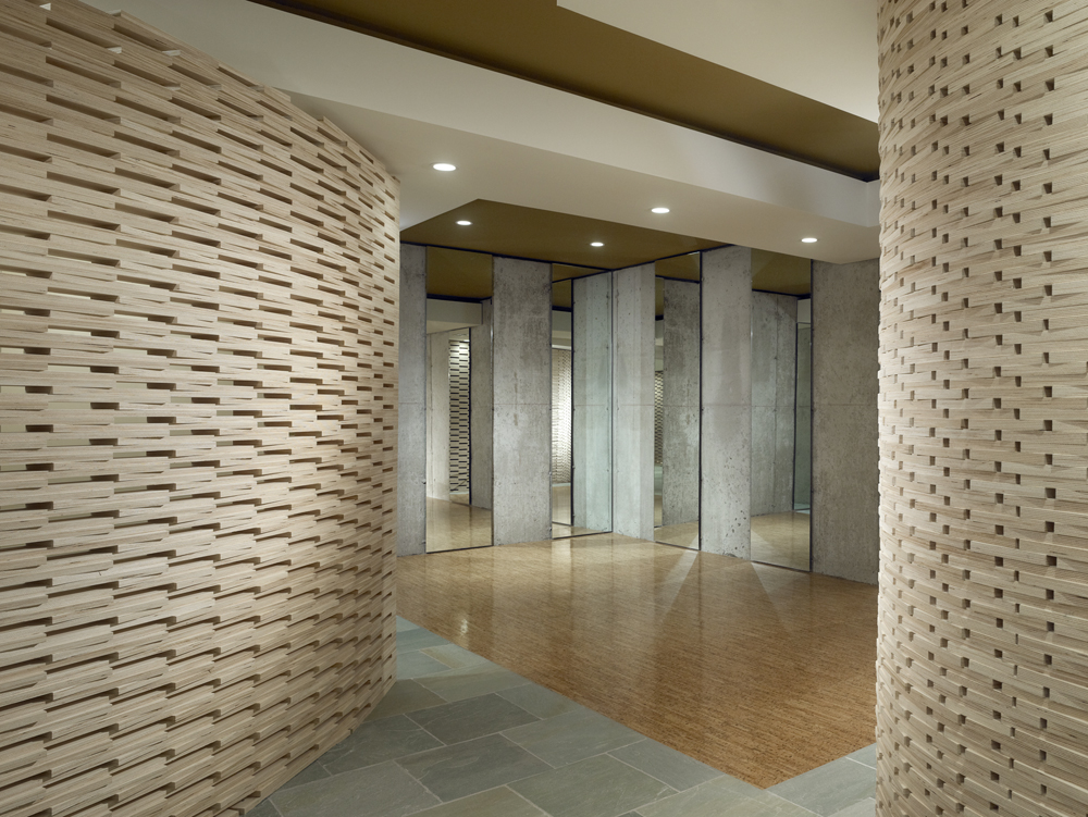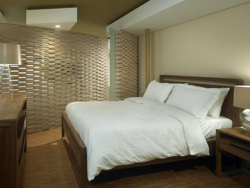 The fluid arrangement of spaces and the tectonic assembly of materials are in contrast to the rest of the house, thus providing a greater sense of transition from the everyday indoor environment. The conventional language of privacy enclosures is replaced with screening elements, typically found in the Eastern world. The partial height screens provide substantial visual privacy yet allow for light and air to permeate through the resultant voids. Drawing on the horizontality of plywood, the walls are assembled to appear woven. Each rectangular piece of Baltic birch plywood is placed individually, not unlike the tedious assembly of the hand-crafted water hyacinth furniture housed in the space.
