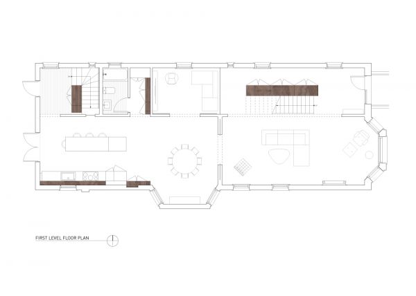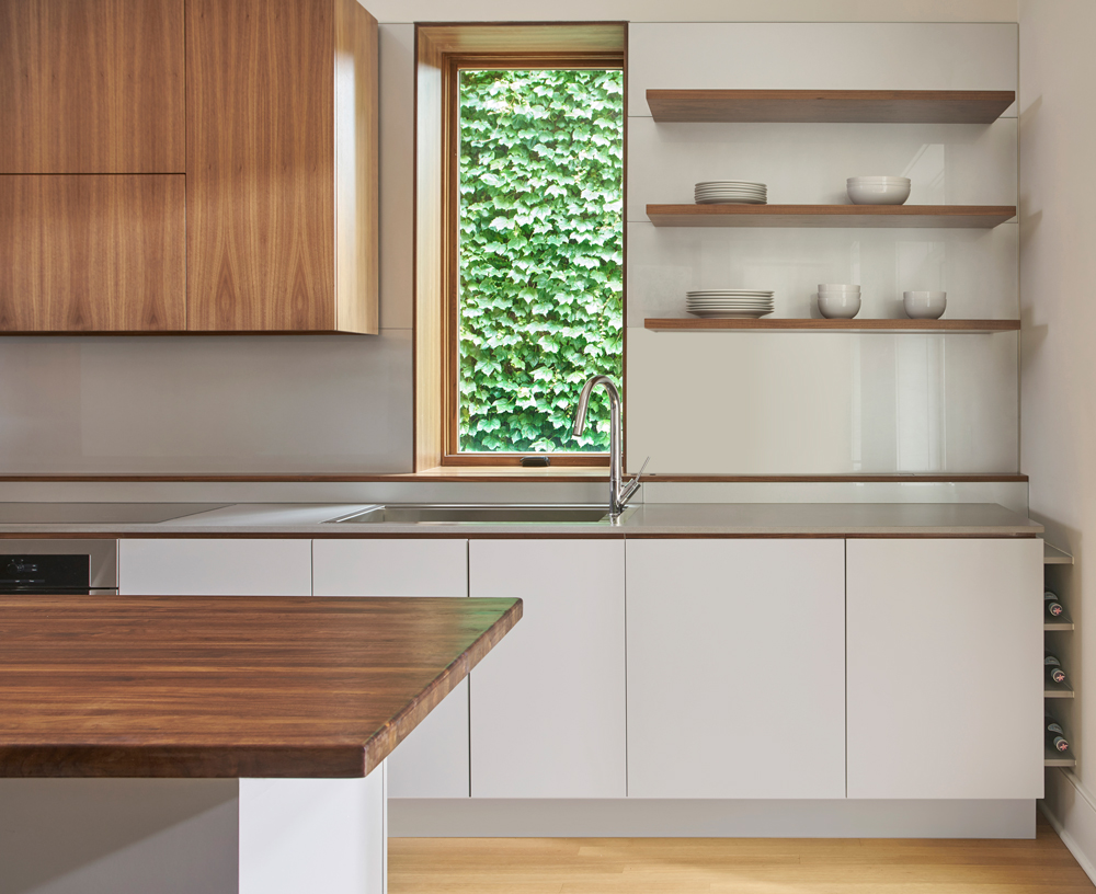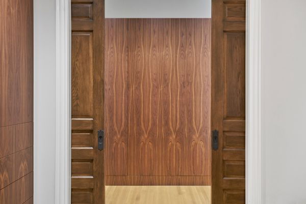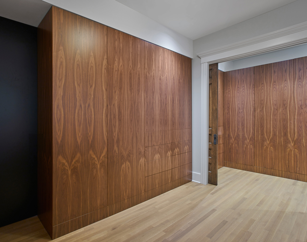 Furthermore, our interest in “phenomenal transparency” as a space-organizing strategy was tested here both in section and plan. Newly-introduced walnut millwork elements were programmed as stairs, walls and storage; these elements physically and visually cut through space, connecting rooms and their adjacent zones. Salvaged old doors, hardware, and trim were seamlessly integrated with the new architectural language, keeping the design composition cohesive, and merging past and present together as one articulated thought. The result is a home that is light, connected, and fully functional for a growing family. The project thus introduces new spatial meaning into an early 20th century building, melding qualities from the past with a design logic and lifestyle for today.