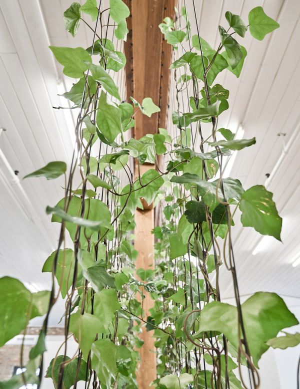 The heart of the office environment is anchored by plant life, via a delicate field of ivy, serving as a separation between work space and the kitchenette. Within the main storage element, the translucent green screen lightens the massiveness of this object visually suspending it from the heavy timber beam. Unlike the storage element, the block like desks anchor the work area. Intended for flexible use, and are oriented in the direction to maximize city views both through and in between the perimeter white walls.