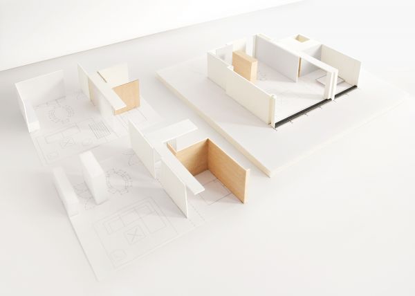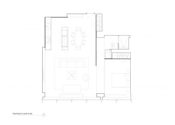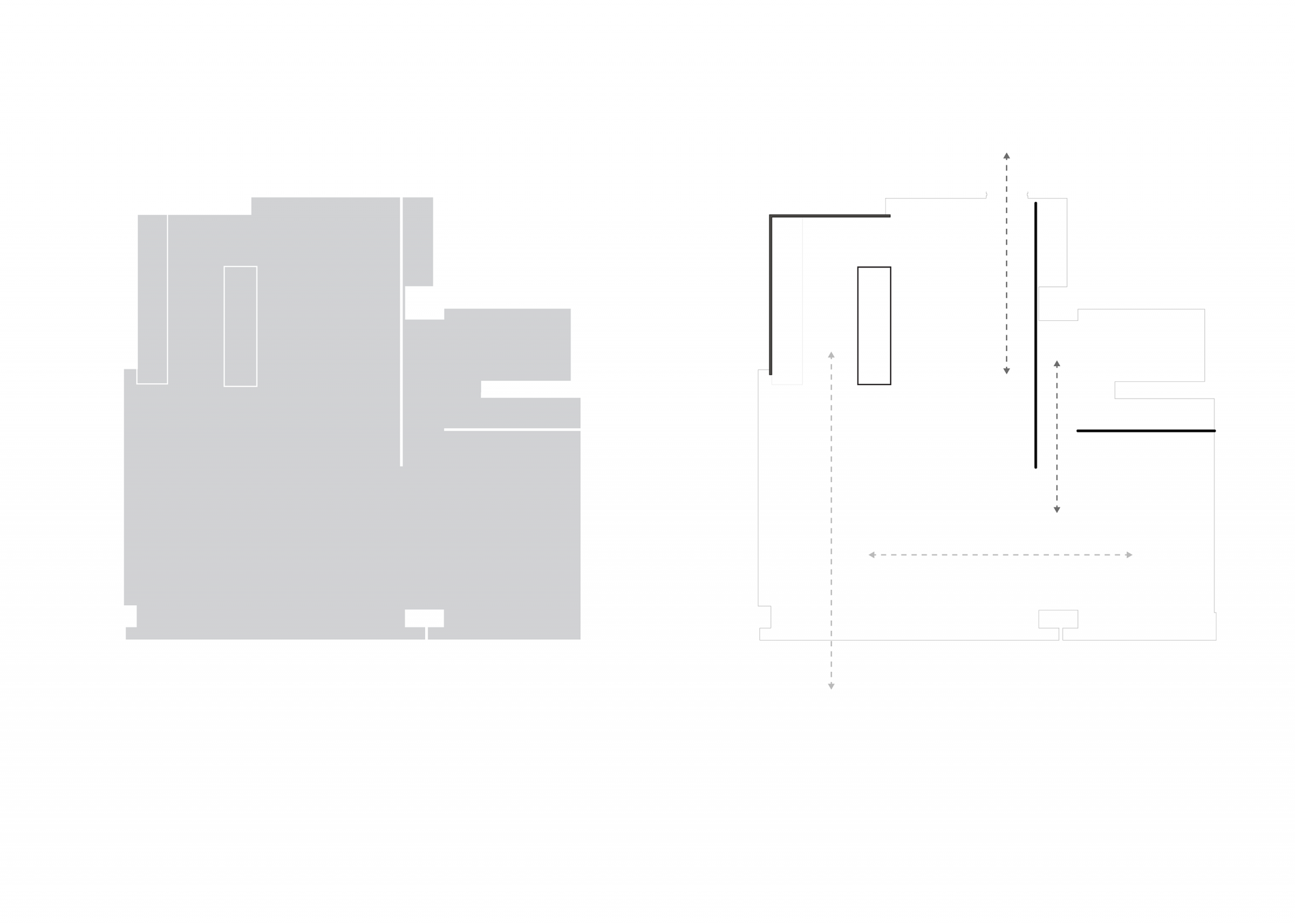 The long east wall separates the bathroom as well as hides the primary storage. Its white reflective surface captures the urban setting and pulls the light further into the space. Once the white reflective separation ends, an absorbent material surface takes over on its opposing side. This change in material and texture is meant to evoke a greater sense of intimacy towards the more private areas of the apartment, while also forming a visual dialogue with the palette used inside the main room.