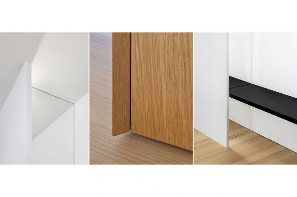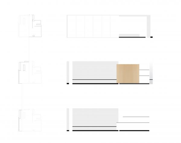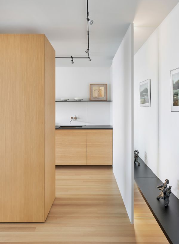 At entry, a tall white oak element welcomes you, concealing variety of daily functions within its tight grain clad walls. The opposing horizontal kitchen section compliments the tall millwork, extending visually into the mirrored backsplash niche. Shelves disappear and reemerge behind the delicate walls, creating a backdrop for everyday living things. These floating black lines organize the primary living space and become visually lighter as they elevate vertically above the ground plane. This play on visual continuity is employed throughout, where reflectivity creates illusions and connections between architectural elements and the spaces that they support.