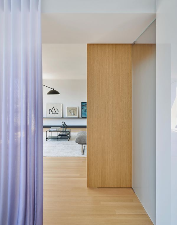 Where the opaque wall terminates it gives way to layers of fabric, echoing nature’s transition of water meeting sky. The curtain “wall” filters light and creates privacy as needed, allowing one to fully open the apartment towards the lakefront and the iconic 860/880 apartments across the way. Theatrically draped across the wood floor the fabric softens the refined ensemble, keeping the overall composition together as an enlivened, cohesive whole.