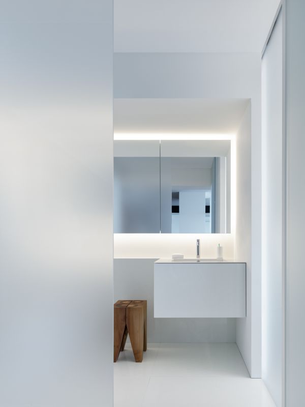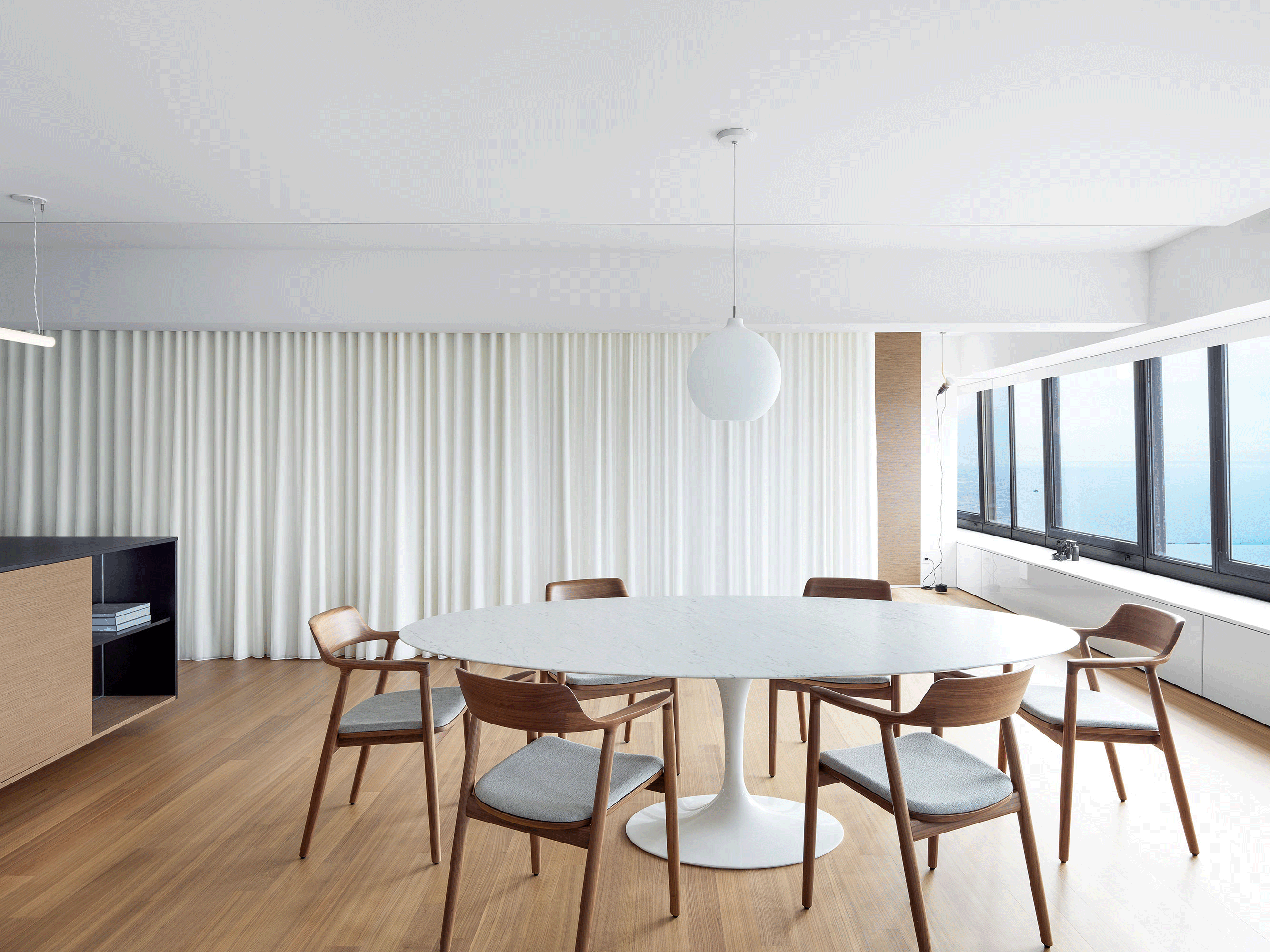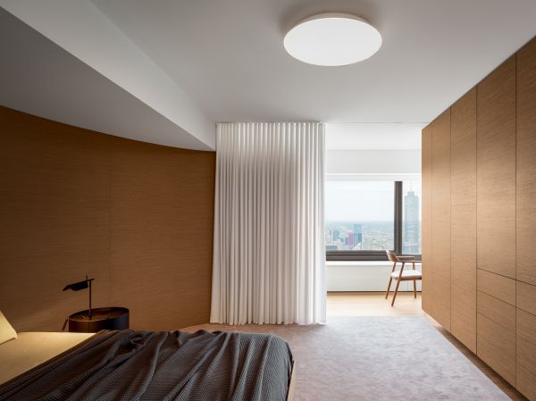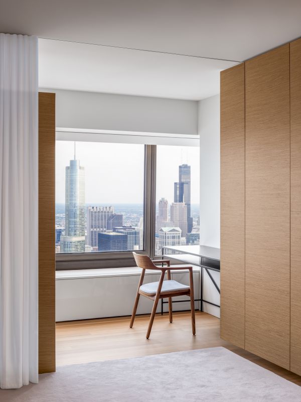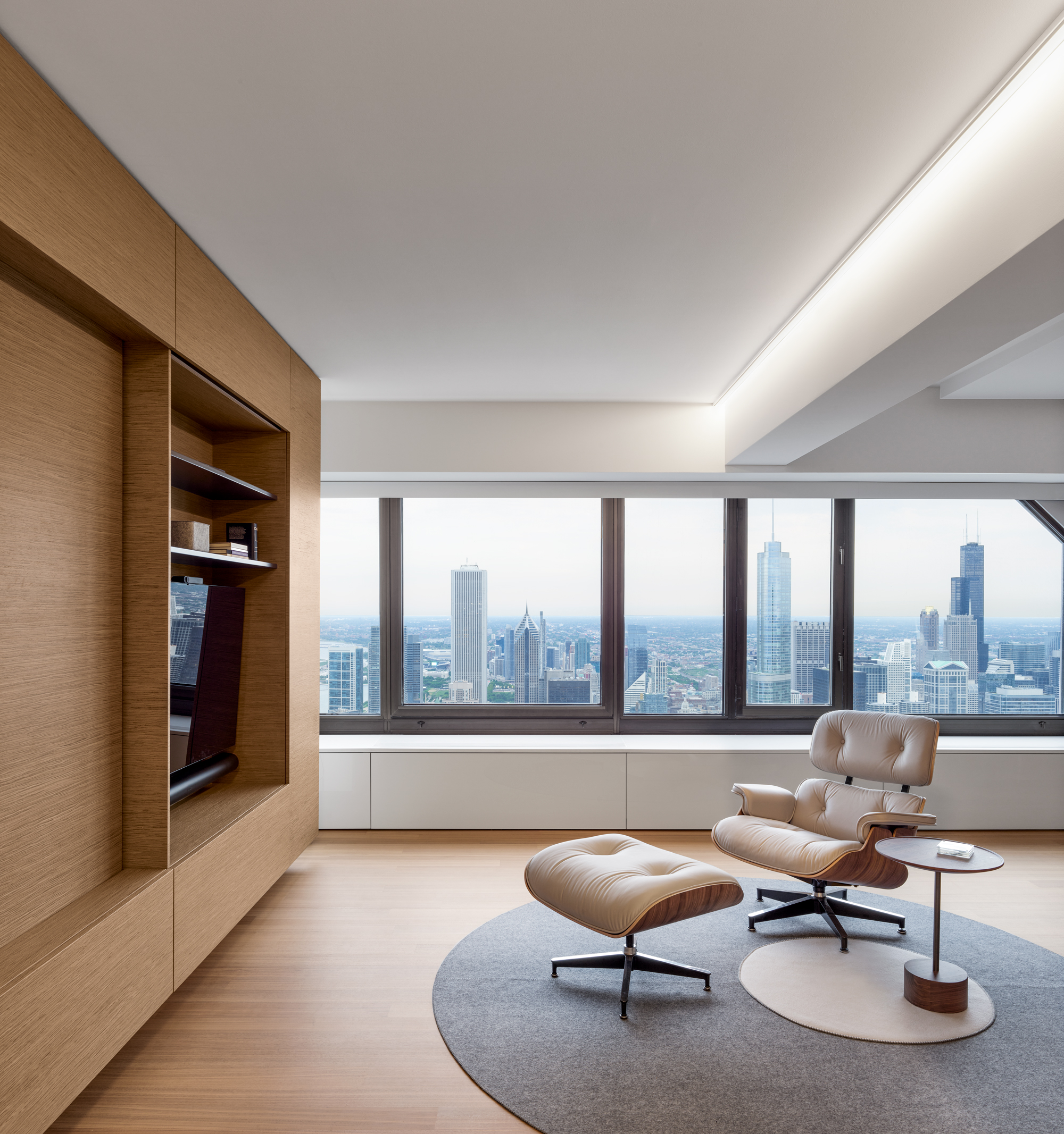 From these observations, our goal was not only to improve daily life in this iconic building, but to amplify the experience of being 1000 feet above ground. To achieve this, we established one continuous aperture across the length of the unit’s footprint, enabling a much more direct connection to the city and dynamic sky. As a result, all the room partitions were pulled away from the exterior and oriented outwards, unobstructed by walls or doors. The primary bedroom is now cocooned behind a curved wall, a formal strategy that opens the viewing angle from deeper sections of the apartment. The existing kitchen is entirely re-configured, seamlessly integrating the shared plumbing stacks. This new arrangement establishes a direct visual dialogue with the living space, as well as Chicago’s iconic city scape beyond.