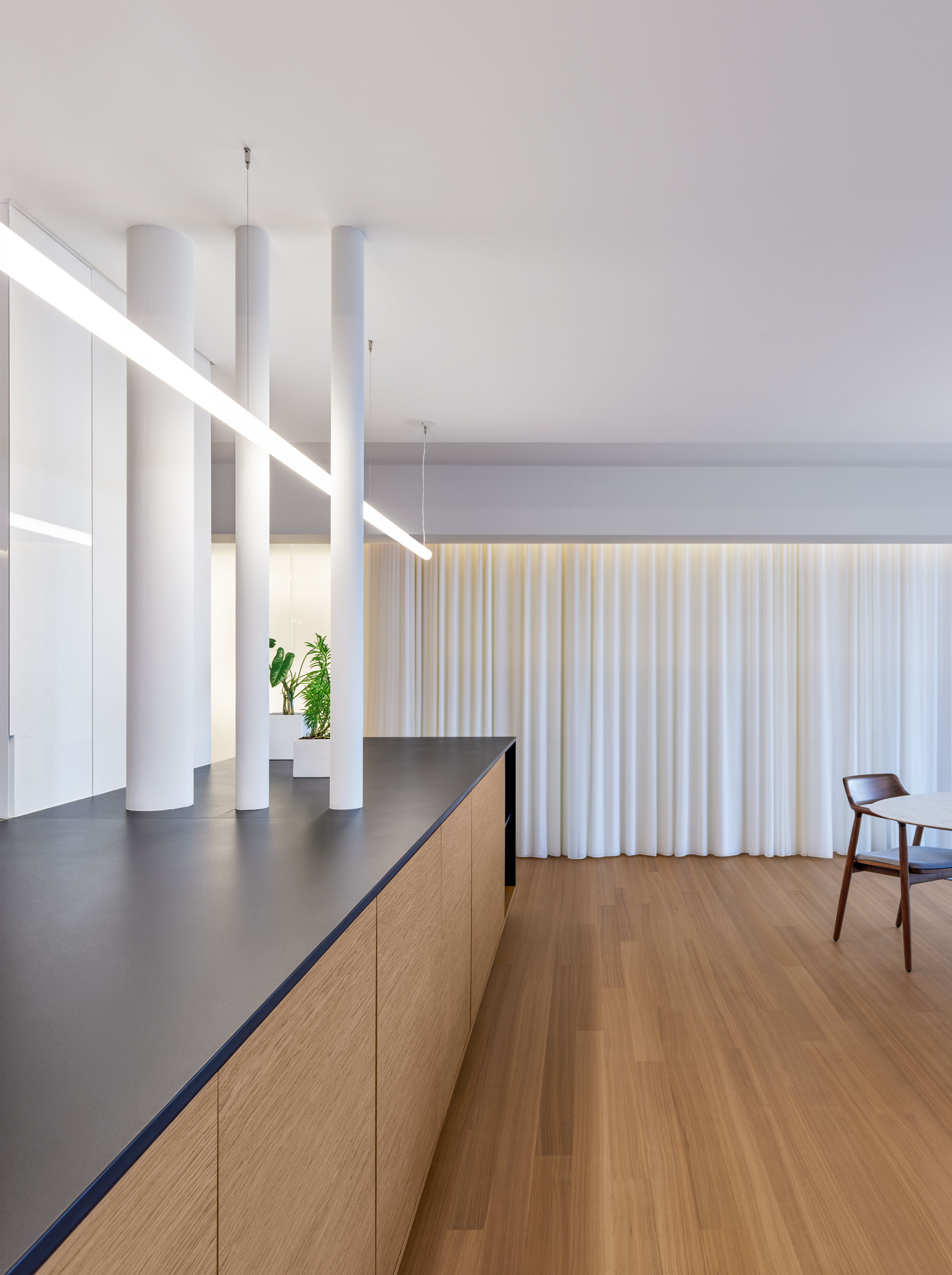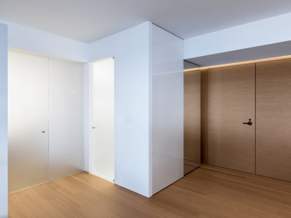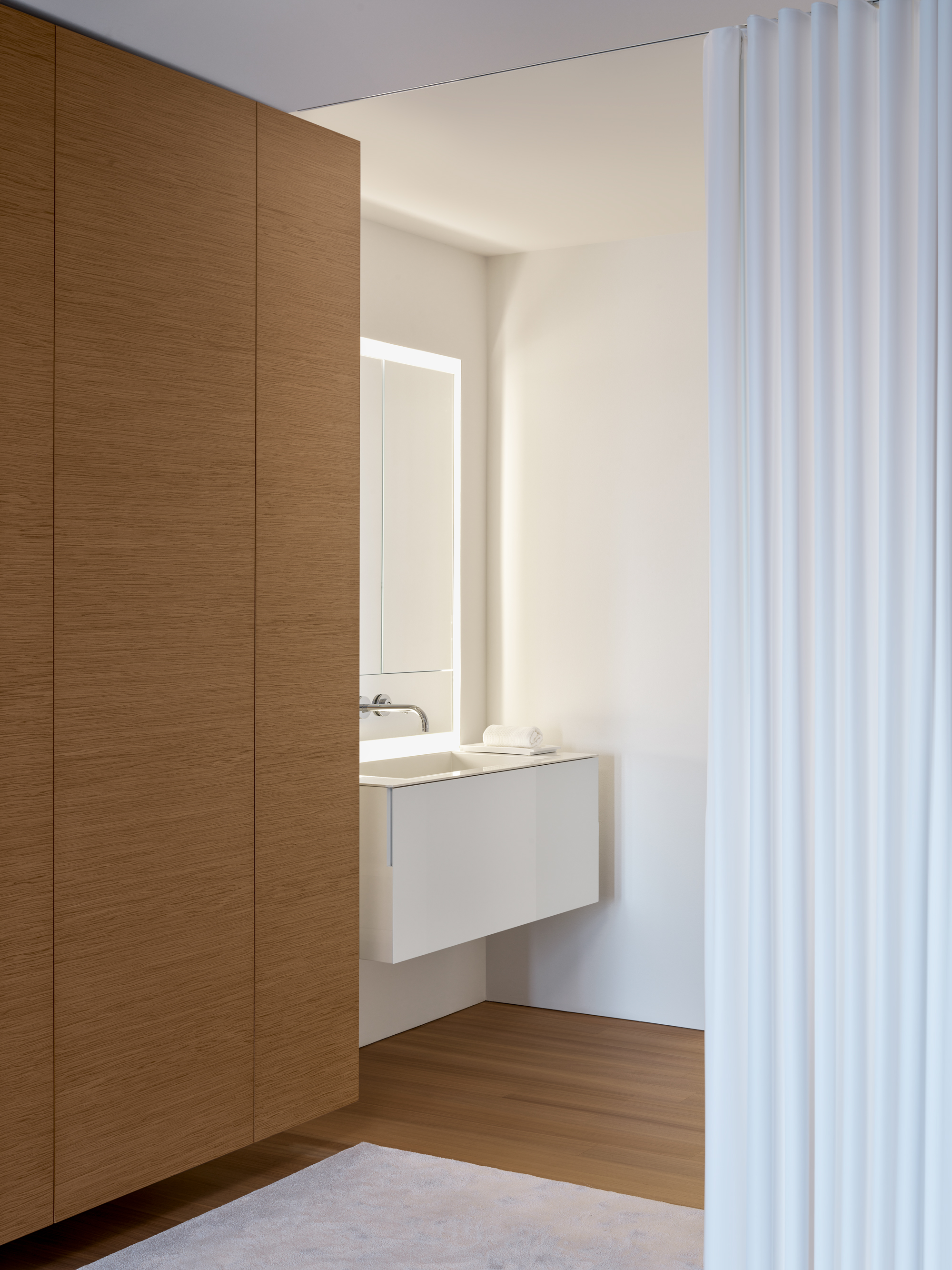 The remaining three perimeter walls of the apartment are visually unified using horizontally-oriented walnut paneling. The floating millwork cabinets contain most of the unit’s storage and a hidden pull-out bed that can form a second bedroom. A fabric room divider softens the interior as a theatric backdrop, while offering privacy as needed.