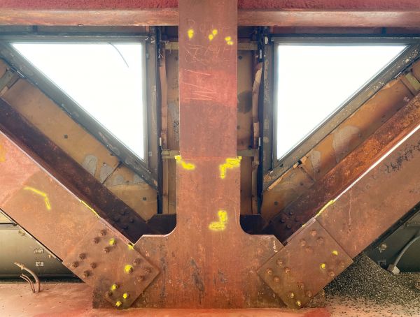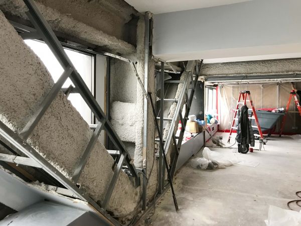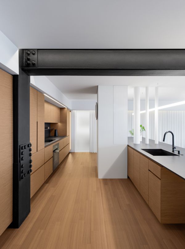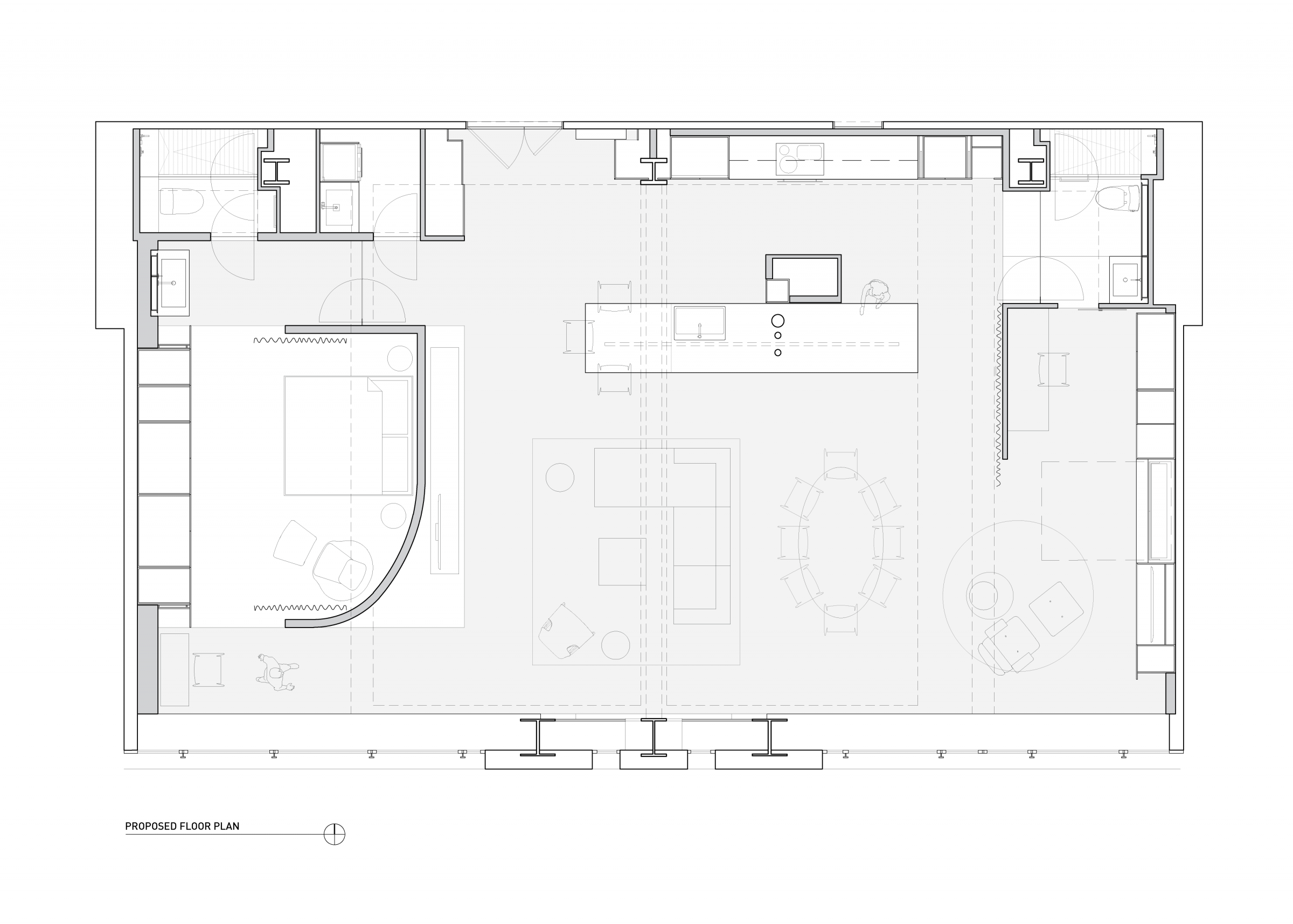 To further develop this relationship, we revealed the diagonal steel members, primary beam, and column. Current fireproofing technology enabled us to remove the old protective layers and free the steel. Now, for the first time since the building was erected, this structure can be seen and touched again. No longer simply structure, the steel bracing is a visual and tactile element that stretches across the living space, bringing the building’s exoskeletal frame inside.