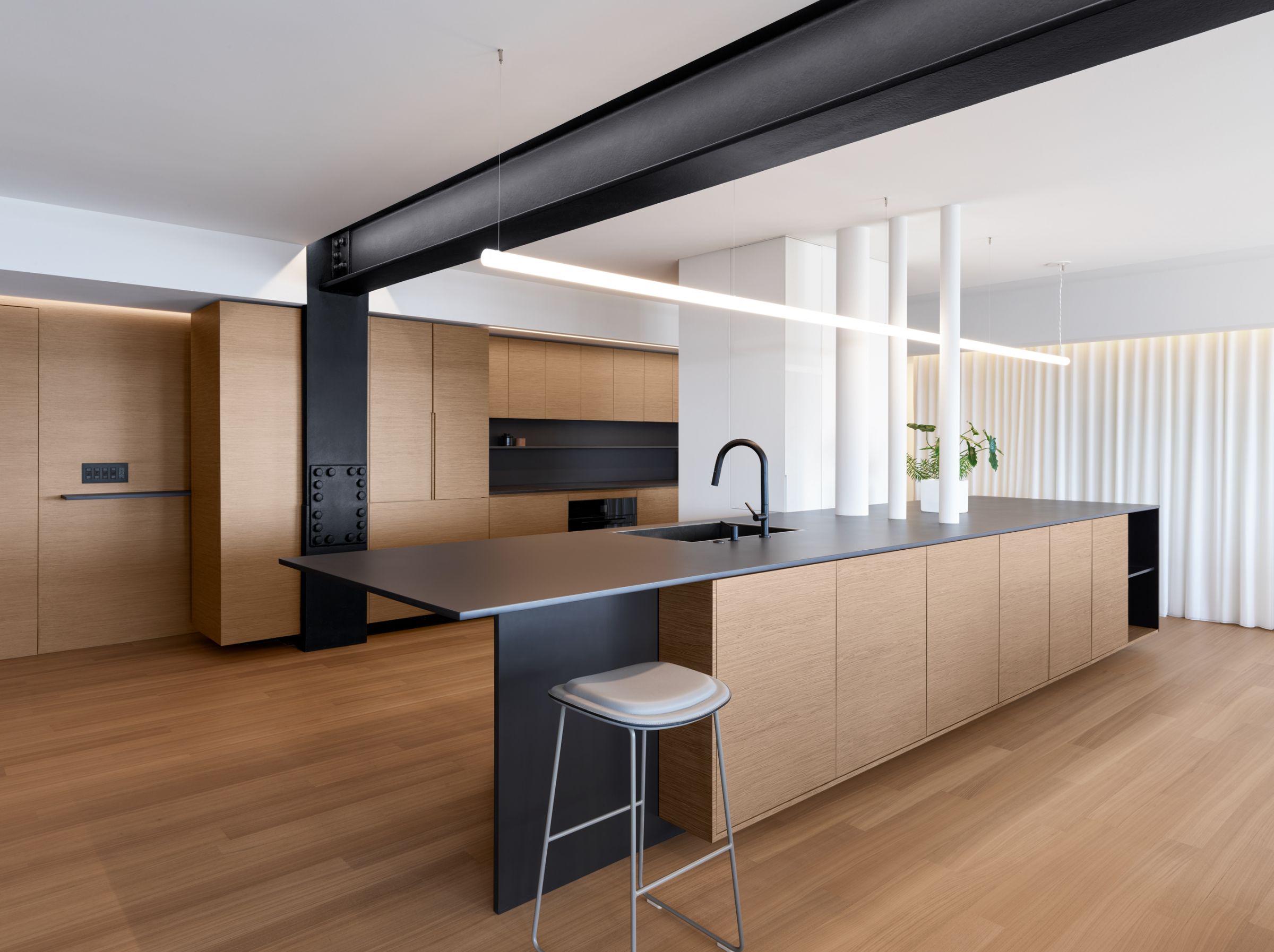 The selection of finishes and time period furniture pieces bring the unit harmoniously together, complementing the exposed heavy steel. This combination of elements attempts to create a link with the building’s identity of High Modernism, while adding a new perspective for our clients living inside this timeless masterpiece.