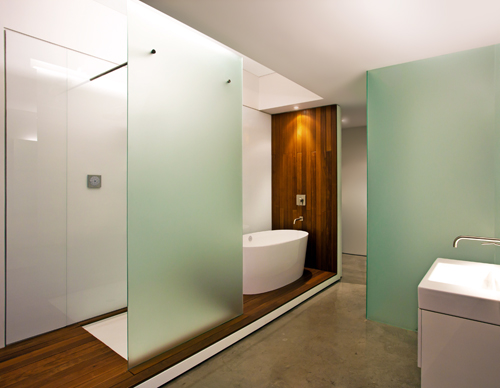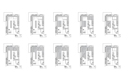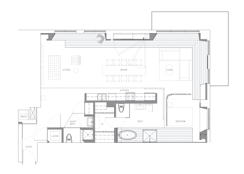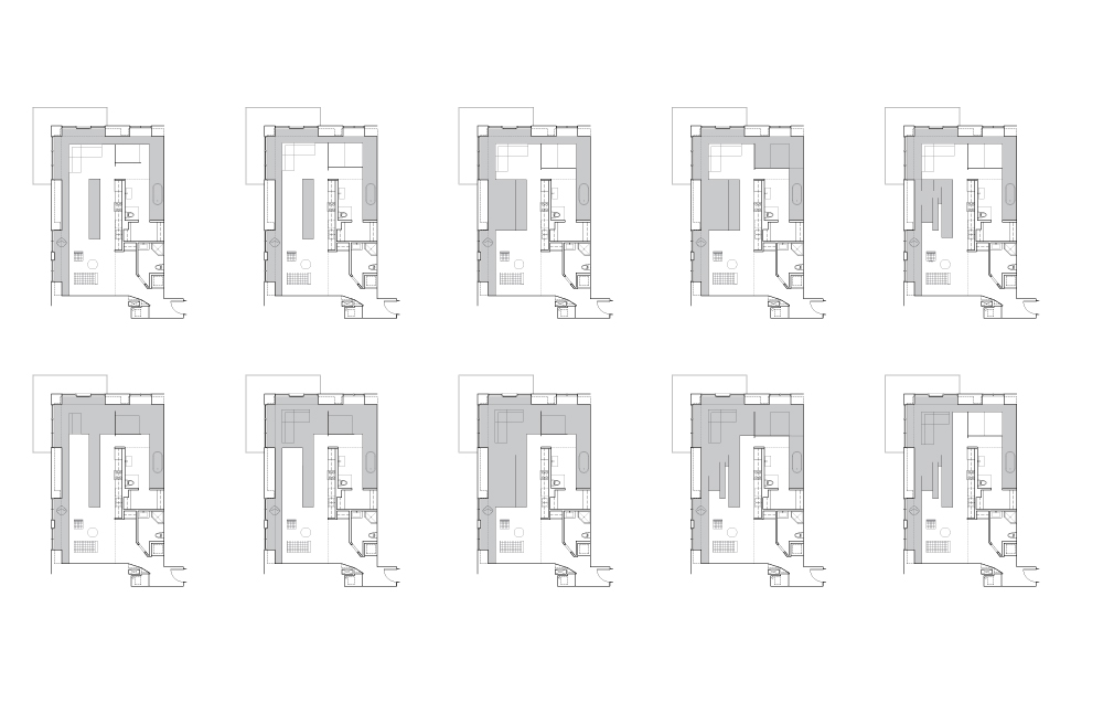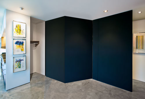 To underline the openness of this apartment, the majority of the existing partitions were removed. The entry sequence is reconfigured and is clad with black metal door panels enclosing two service areas. These large panels can be positioned in such a way as to provide a common hand washing area or a private second bath.